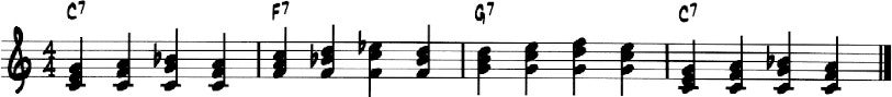 Back to the C7 chord progression example. Here, the C7 chord can also be alternated rhythmically with an F7 chord (a fourth in C). In turn, an F7 chord can be alternated with a Bb7 (B-flat), a G7 chord with a C7, and so on. The alternative chord is always a quarter tone higher in pitch and often played roughly on the last count of the measure.
