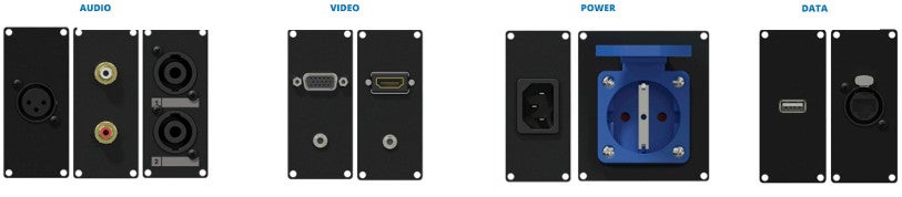 In terms of modules, you're offered a wide choice of pre-fitted connector types: audio modules with microphone, line and speaker connectors, video modules with VGA and HDMI connectors, power modules with Euro and Schuko connectors and data modules with USB and etherCON connectors.