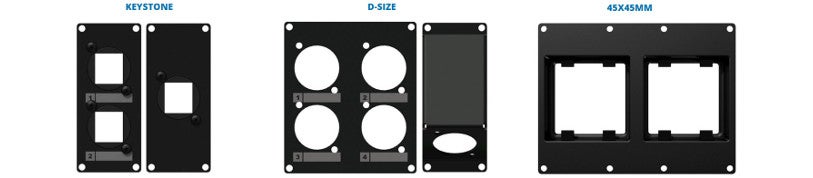 Furthermore, Caymon offer cover plates with pre-cut holes for D-size connectors, cover plates with 45 x 45 mm holes for matrix or volume controllers and cover plates with holes for PROCAB Keystone connectors.