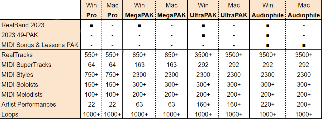 Always the Newest VersionWhen you pick up any version of Band in a Box, you're always getting the very latest edition. Click on the version you're looking for above, add it to your basket and once it's ordered and paid for, we'll email over a PDF including a download code and link so you can download the most recent edition. If we're out of stock, then your PDF will come through as soon as our supplier has delivered new download codes. If you want to be certain that you can get your software straight away, make sure to check the estimated delivery time on the product page. The Audiophile editions are the only titles that can't be downloaded. Instead, they come in the form of a physical USB drive pre-loaded with installation files. Band in a Box: What is it?There are plenty of people who can write a melody and maybe have an idea of a set of chords to go with it, but to make a complete, produced song might be a step too far. Technically, Band in a Box is a DAW (Digital Audio Workstation), but it's also not. Most standard DAW software is laid out for users to build productions from the ground up, so you can add your idea for a melody, but from there, everything has to be written and arranged from scratch. For an experienced musician or producer, this is easy, but not everyone is an experienced musician or producer, which is where Band in a Box comes in. When you stick your melody into this package, it throws up an array of instrumental arrangements that you can choose from. This can be MIDI data for controlling virtual instruments, but it can also be real audio recordings of real musicians who have laid down a range of general 'phrases' that you can use to support your melody and build an arrangement. Obviously, the wider the array of phrases you have to choose from, the bigger the potential gets - which is exactly why Band in a Box offers various different editions. Band in a Box: The Different EditionsPG Music offers four different editions of Band in a Box, each offering more content than the next. These are Pro, MegaPAK, UltraPAK and the Audiophile Edition, and each is available for Mac or Windows for a total of eight titles. In the table below, you can see what you get with each title, and then below that, you can read a more detailed description of some of the features. RealBandRealBand is only available for Windows users and combines the accompaniment functions of Band in a Box with the sequence options of the PowerTracks Pro audio software. RealBand comes with automatic accompaniment, RealTracks, RealDrums and more. 49-PAKThe 49-PAK is an expansion pack for RealTracks and RealStyles for the Windows version. Basically, it sets you up with even more content. MIDI Songs & Lessons PAKYou can also get some add-ons for Band in a Box, so PG Music have bundled up a few of these add-ons in the MIDI Songs & Lessons PAK, which includes the titles: MIDI Essential Riffs and Phrases, MIDI Fakebooks, 200 Folk Songs and Instrumental Studies. RealTracksThe RealTracks are the audio recordings that can be used to give your arrangements form. These are phrases of one or more bars and can be set to follow a chord progression that you input yourself. You can also adjust the parameters of these phrases, like the volume level and so on. MIDI SuperTracksMIDI SuperTracks is a creative bonus for anyone who finds RealTracks a bit limiting in terms of sound. Instead of audio phrases, it provides MIDI data for controlling VST instruments, which immediately opens up more creative potential. MIDI StylesMIDI Styles is another Band in a Box add-on that offers various styles and beats in the form of MIDI data, which can be used to control any virtual instrument you select. MIDI SoloistsAnyone who thinks that Band in a Box only offers bass lines and chord progressions needs to think again. With MIDI Soloists, you can add the all-important melody to your songs. MIDI MelodistsThe MIDI Melodists add-on makes things really easy by putting together an entire song complete with intro, chords, melodies and more. Artist PerformancesWhile RealTracks makes it easy to put together impressive chord progressions, Artist Performances is a sort of library of demos built out of a set of RealTracks. These demos are a useful learning tool since they demonstrate everything you can do with RealTracks. LoopsAs you'd expect, Loops sets you up with a library of loops, whether it's a drum loop, percussion loop, or even looping nature sounds - it could be anything. Loops are handy but can be hard to build from scratch, so Band in Box includes a massive stack of them.
