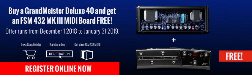 Buy the GrandMeister Deluxe 40 Tube Guitar Amp Head between 1st December 2018 and 31st January 2019 and Hughes & Kettner will give you the versatile FSM 432 MKIII MIDI board footswitch for free! |