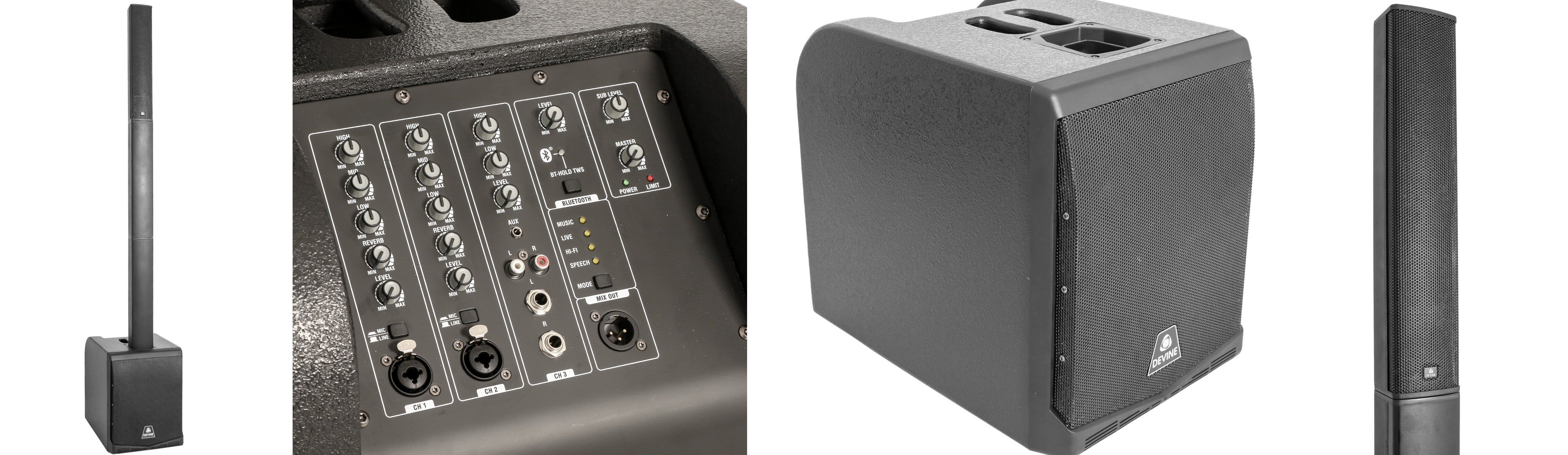 Vertical Array Column SpeakersPerfect for tinkerers and hobbyists as well as fully-fledged sound techs, column speaker systems have proven to be a welcome pro audio solution. Column speakers not only eliminate the need for bulky, stand-mounted speakers, but cover the entire frequency range. Column speakers generally feature a subwoofer module and a built-in mixer that combine to make up the base, forming the foundation for an array of vertically-configured speakers. They're easy to set up, look nice-and-clean and can be placed in sight or tucked away in the corner. The Vertix C10AThe Vertix C10A combines a compact and portable design with a broad sonic spectrum, where the latter is twofold. Easy to UseWhat's great about column speaker systems is that they're typically just as easy to use as a standard Bluetooth speaker. After stacking the speaker modules on top of the subwoofer module, it's simply a matter of plugging in and getting started. The Vertix C10A features a modest yet reasonably extensive mixer section on the back of the subwoofer unit where you can hook up microphones, instruments, external PA mixers, DJ controllers and so on. Meanwhile, music can be streamed from a phone or tablet via Bluetooth, or played back via the fitted mini-jack AUX input. The Vertix C10A comes with individually adjustable main and subwoofer volume controls, as well as a customisable DSP complete with four presets for quick-starting the music. Solid All-RounderThe great thing about the Vertix C10A is that it's an all-in-one PA solution for countless jobs and modest crowds. From business presentations, public service announcements and background music, to house-and-garden parties, bingo night and singer-songwriter-style set-ups at your local pub, Devine's all-new affordable column speaker system can take care of it. Related brandsRelated products |